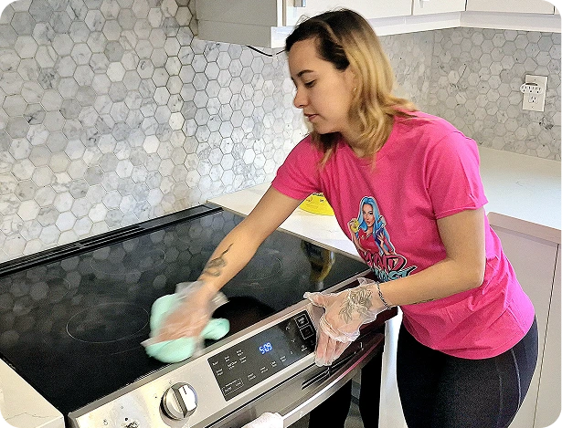 House cleaner cleaning a bathroom cabinet during a residential house cleaning service.