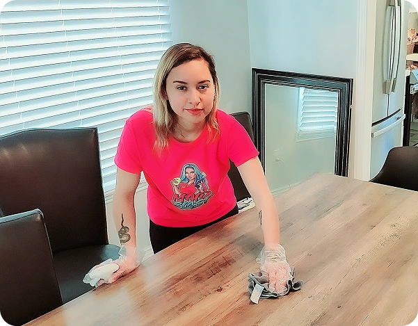 Cleaner cleaning a coffee table in the living room during a residential house cleaning.